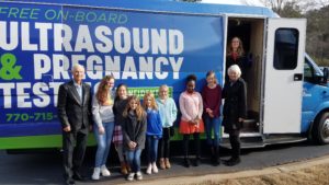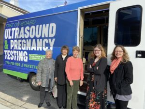 On Sanctity of Human Life Sunday, January 19th, Luci Hough and Niki Garner were at Harp’s Crossing Baptist Church. We are grateful for the warm reception and invitation for Luci to speak at both services. Niki drove Benjamin and enjoyed giving tours. Volunteers from Harp’s Crossing are shown with Benjamin (L-R) Jamie Ballard, Luci, Margaret Penrod, Megan McBride, Niki. Pastor Dennis Watson stopped for a picture with Luci and Harp’s Member and Fayette PRC Client Coordinator Debbie May.