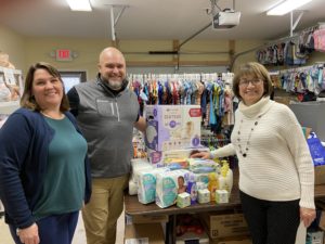 Pastor Lance Sumner of Connection Church visited the Center on January 30th and brought baby gifts for our Clothes Closet. Pastor Lance is shown with Marci Carr, Clothes Closet Coordinator, and Luci.
