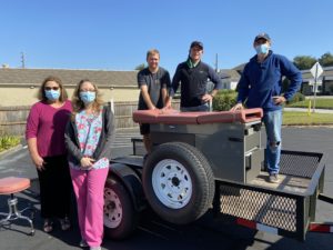 We are so grateful to Barbara O’Brien, MD for donating an exam table to our Center. We are excited to have a major piece of equipment ready for our intended building expansion which will include a second medical room! Congratulations to Dr. O’Brien on her retirement! Thank you to Joey Petras for handling the move. Dr. O’brien (L) is shown with Niki Garner, FPRC nurse manager, and Jason, Joey and Keith on the trailer.