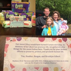 We had a visit on April 30th from the Gilbert family who decided to bless our babies in memory of their daughter, Riley, and to honor her on what would have been her 8th birthday. We are touched and so grateful. Thank you Heather, Tim, Reagan, and Brooklyn!