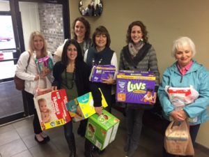 On March 14th Luci spoke to Moms for Moms at First Baptist Church Peachtree City. Thank you to Jennifer Franklin, the leader of Moms for Moms, for inviting Luci to give her testimony and share about Fayette PRC. Luci (middle) is shown with Jennifer (on right with big Luvs box) and several ladies from the group along with Mentoring Mom Marilyn Frazer (right, in blue). The ladies are holding the baby gifts they brought for our Center.