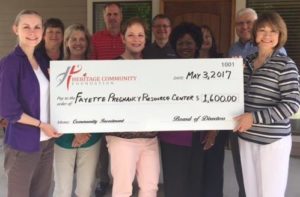 On May 3rd, executives from the Heritage Bank and the Heritage Community Foundation visited to present their grant for our Child Safety Program. This grant will fund car seats for our clients who complete our Child Safety Class. Â Angela and Luci are shown with Volunteer Loren Williams and the group from Heritage.